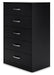 Practical and attractive, this chest of drawers blends seamlessly with modern decor and makes a smart addition to a bedroom. Five spacious drawers will keep your clothes neat and organized. Sleek metal pulls in a brushed nickel-tone finish add to the streamlined aesthetic. Combine with other pieces in the collection to create a room that’s smart and stylish.