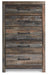 When merged in just the right way, rustic and industrial styles can make one happy marriage. Case in point: this bedroom chest. A refined take on barn board beauty, its complex, replicated wood grain showcases hints of burnt orange and teal tones for a sense of weatherworn authenticity. Elongated drawer pulls elevate the aesthetic.