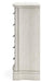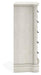 Add a touch of romance to your bedroom with this chest of drawers. Its antiqued white painted finish and serpentine-shaped silhouette details are the picture of easy elegance. Five spacious drawers offer ample storage space, while custom-designed bar pulls add originality.