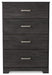 With its clean-lined look and modern attitude, this chest of drawers is a fresh style awakening. A warm charcoal hue over replicated oak grain easily complements other furniture finishes. Smooth drawer fronts with antiqued pewter-tone handles complete the aesthetic.