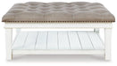Ideal as a footrest or coffee table stand-in, this ottoman coffee table adds an all-purpose farmhouse touch to your living space. Crafted with comfort and convenience in mind, this square ottoman features a faux leather button tufted seat with nailhead accents. Enhancing its casual appeal, a handy lower shelf houses throws, reading material and other essentials.